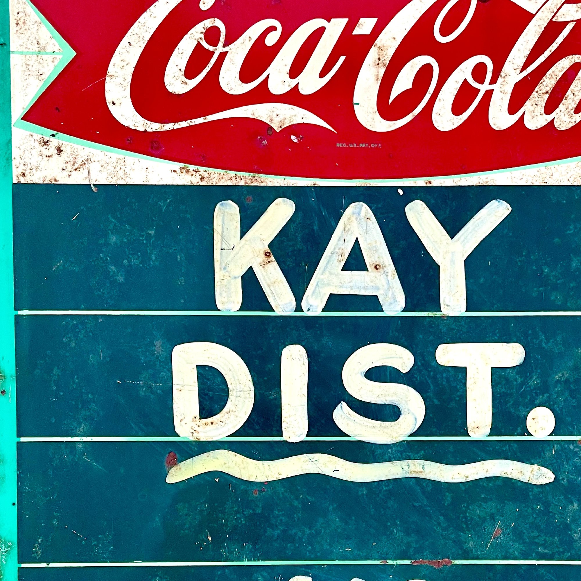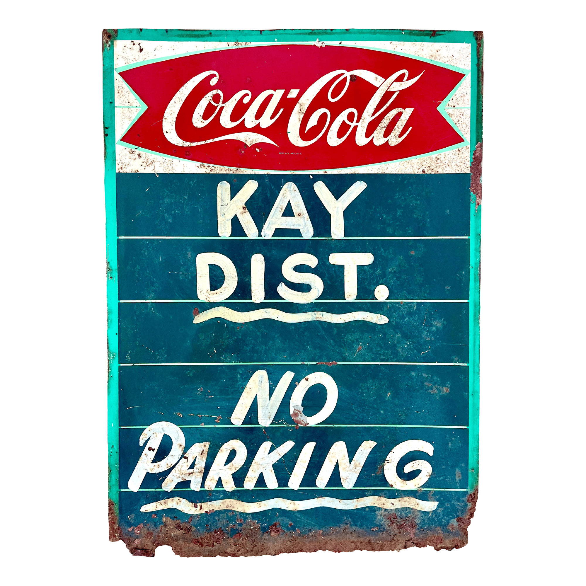 "No Parking" street sign painted on a Coca-Cola fishtail menu board. As found.