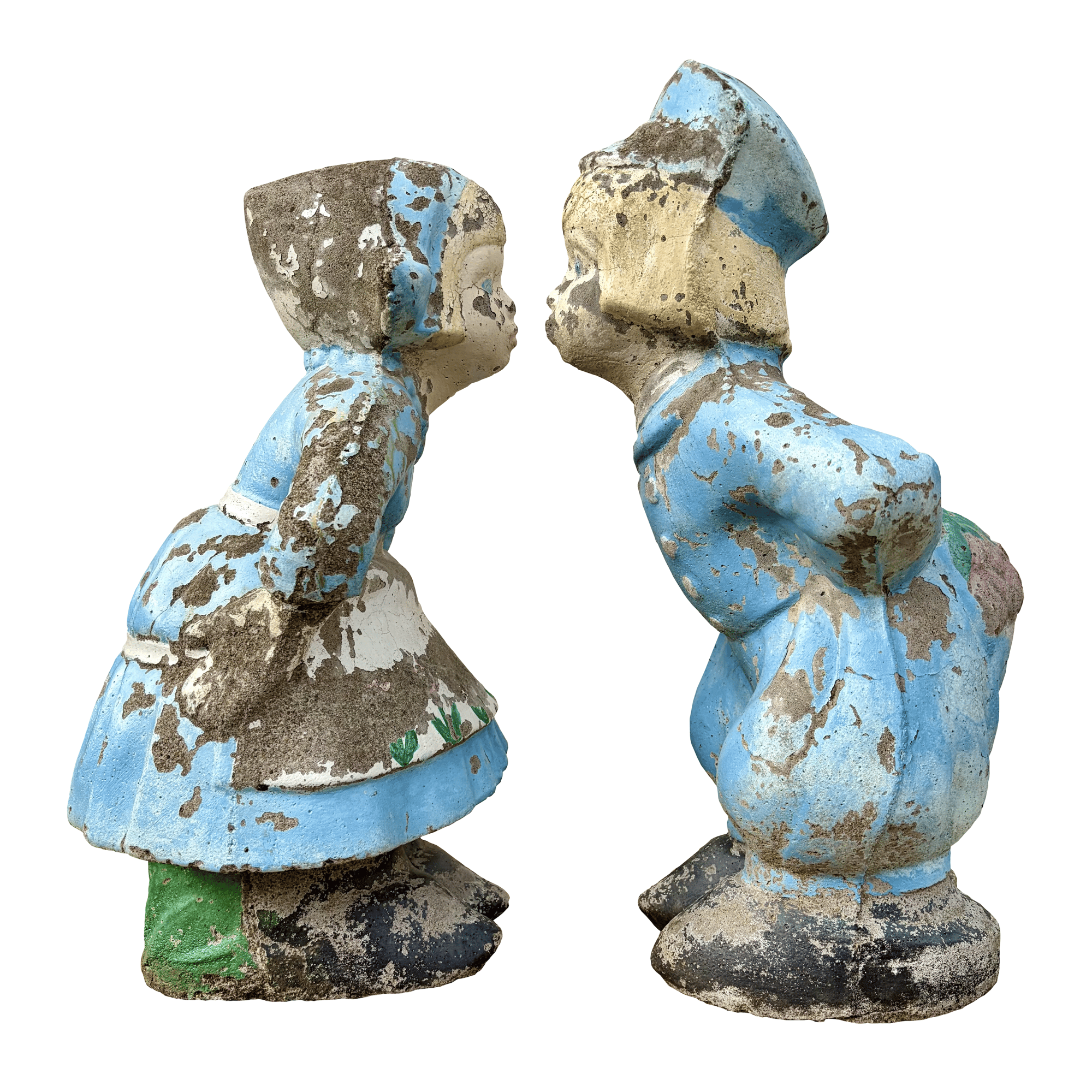 Heavy concrete Dutch kissing couple lawn statues. Just enough color is retained for those that enjoy an authentic chippy patina.