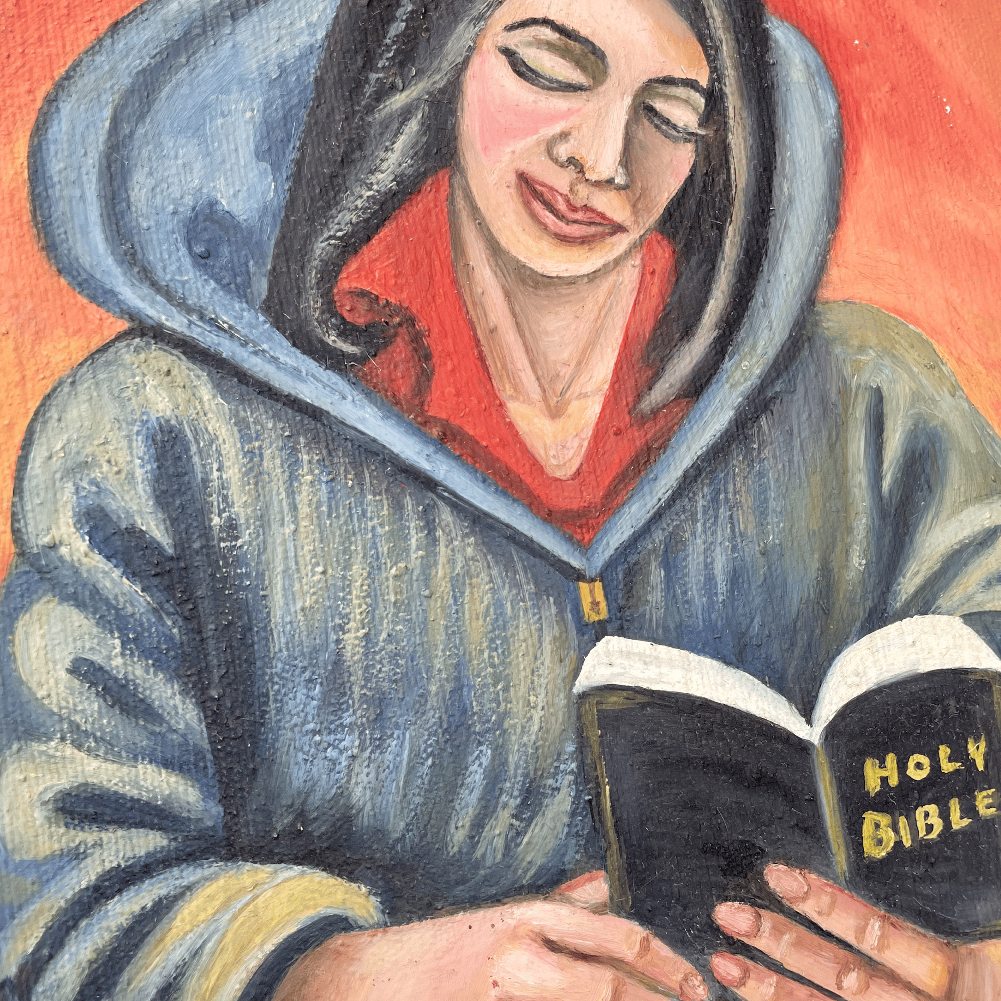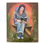 Naive portrait painting of a hoodie-clad woman reading the Bible. Titled "Late Summer Reading" and signed by Myrna Underwood in March 1981.